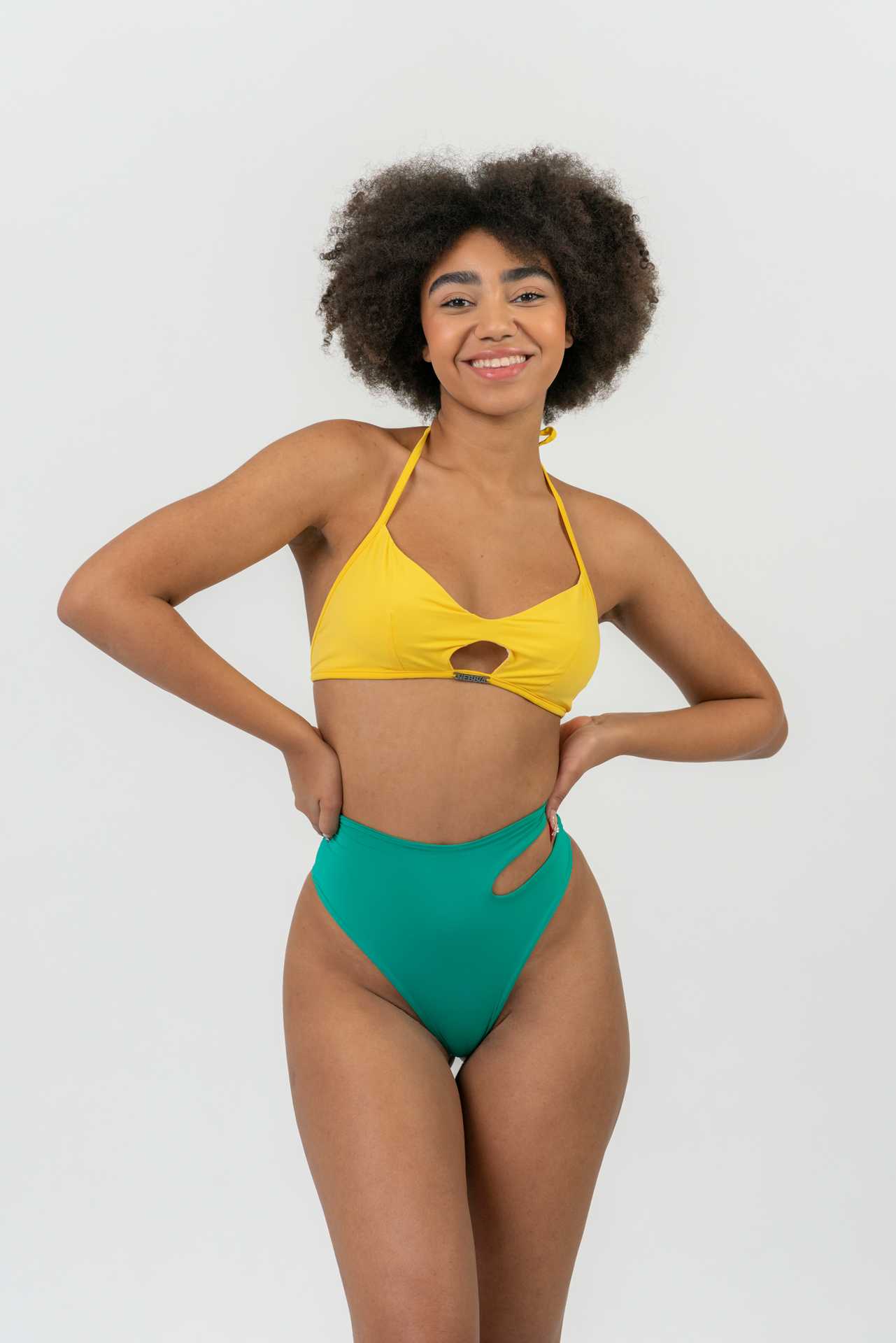The bikini top has the timeless bikini band at the back and neck, so it is easy to adjust and fits perfectly. The bralette-style front, accentuated by an inverted V-shaped cut-out, makes an attractive cleavage for all types of breasts. For all outdoor activities that make you feel good in a swimsuit.