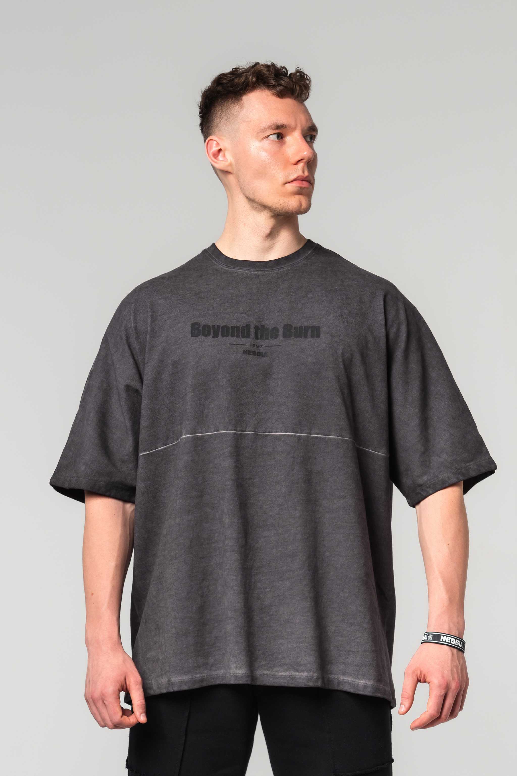 The oversized T-shirt with longer sleeves is exactly what you need to accentuate your physique. Its truly oversized fit with a dropped shoulder effect makes you look bigger, while the bold NEBBIA print shows off your broad back. Plus, the heavyweight cotton with a washed-off design enhances the muscular look of your chest.